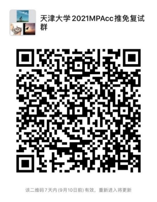 请进入复试名单的申请人扫描下图二维码,于2020年9月7日24:00前加入复试微信群,确认参加9月11日复试事宜,方便后续沟通(进入群后请改名称,格式为来源院校+姓名)。未尽事宜请拨打经管学部会计专硕项目招生电话(022-27891423)详细询问。
