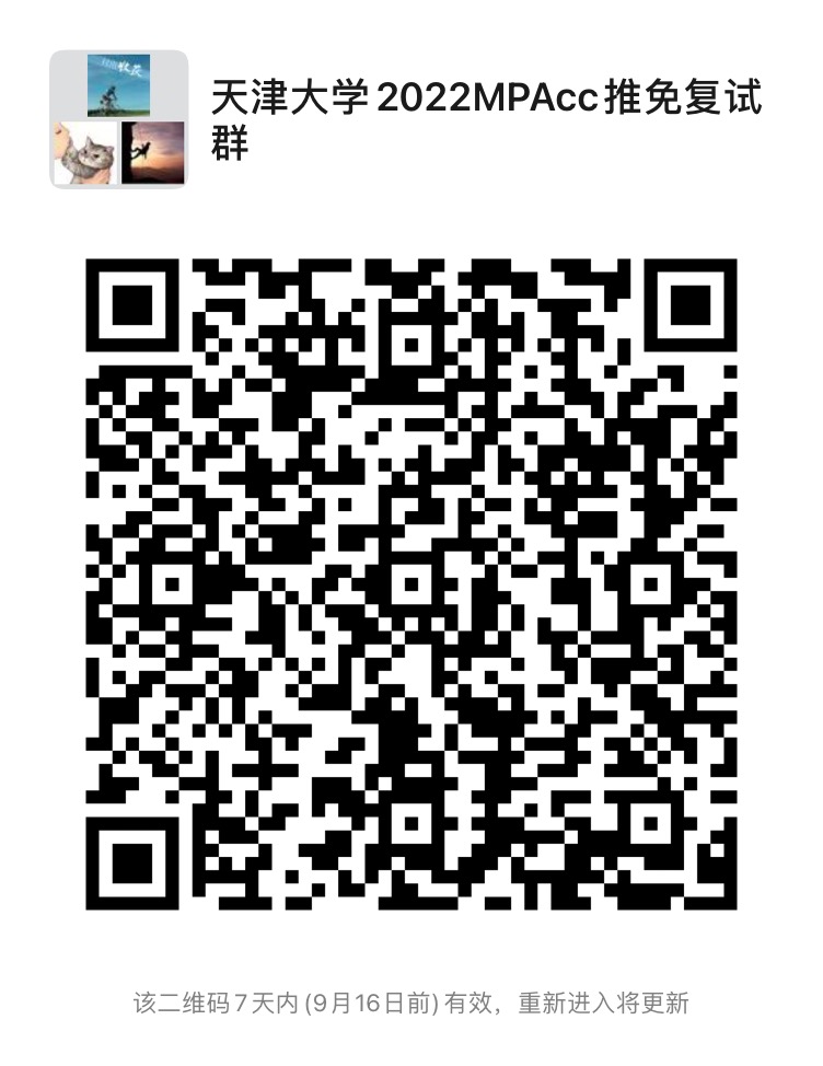 请进入复试名单的申请人扫描下图二维码,于2021年9月12日24:00前加入复试微信群,确认参加9月16日复试事宜,方便后续沟通(进入群后请改名称,格式为来源院校+姓名)。未尽事宜请拨打经管学部会计专硕项目招生电话(022-27891423)详细询问。