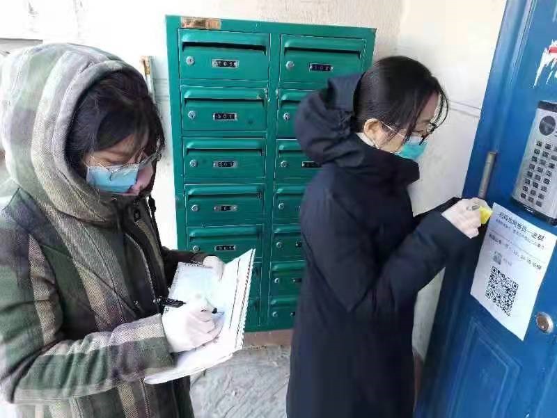 温茹(左) 河西区挂甲寺街道重华社区 上门询问居家隔离情况