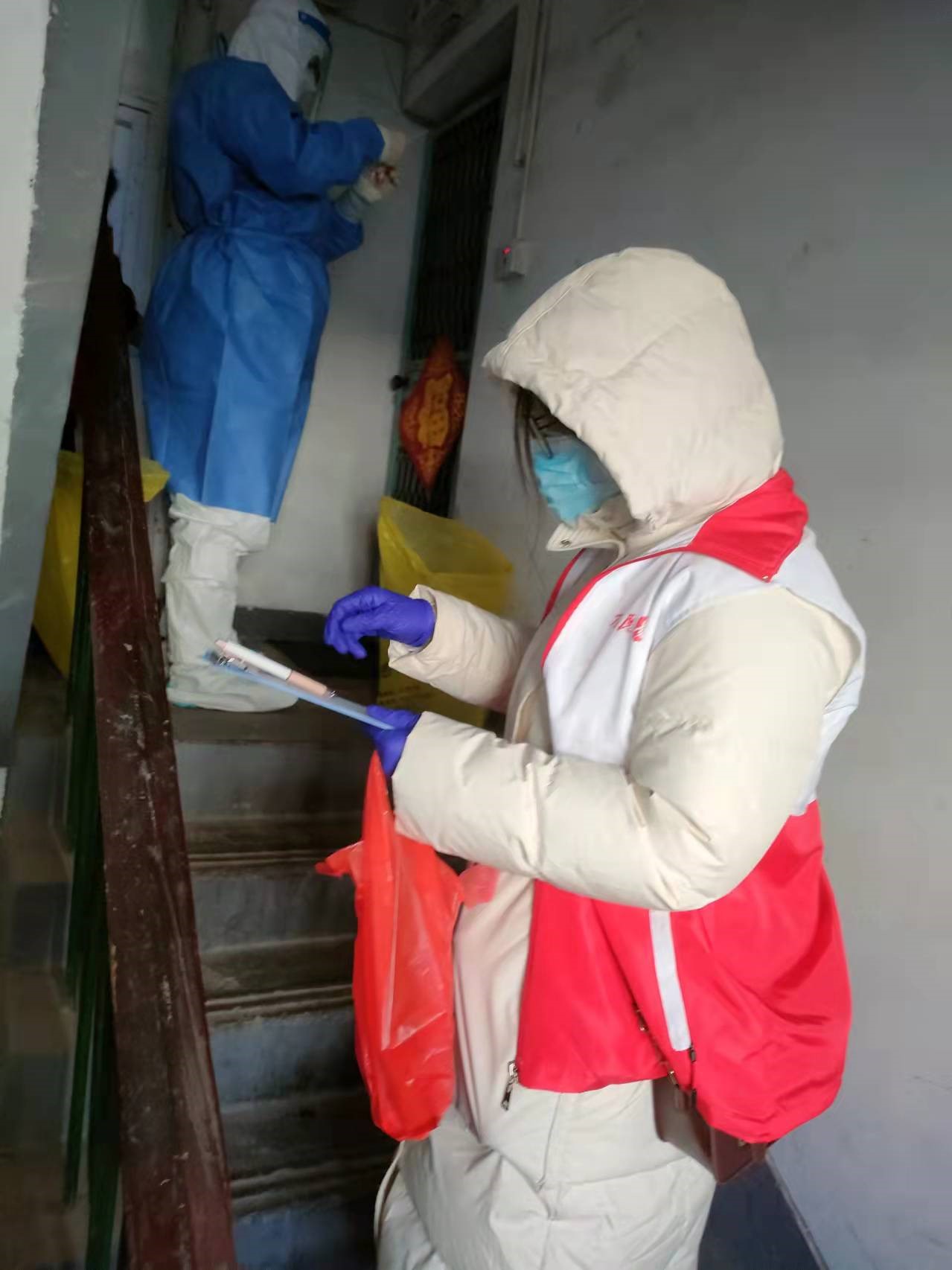 自河西区全面开展“敲门行动”以来,下沉干部、街道社区工作人员和志愿者们挨家挨户敲门走访,上门采样,用温度和爱敲开百姓“心门”,守护百姓平安。2020级非全日制MPAcc青年党员李喆在第完成第三轮核酸检测工作后,与志愿者、医务人员一起开展“敲门行动”,为不便外出的居民提供上门服务。李喆与同事深切落实“敲门行动”,建立底册,全面了解年年居民、身体不便居民的实际需求,以及居家隔离现状,严格落实核酸检测不落一户、不落一人。入户检测时,为了防止感染,尽量减少乘坐电梯,不管多高的楼,都要爬上去,特别是背着沉重的检测设备爬楼,其中的辛苦不言而喻,但她坚持分秒必争,累计服务200余人次。作为天大的一份子,她牢记为学校争光;作为共产党员能为群众做实事儿,她感到万分光荣。