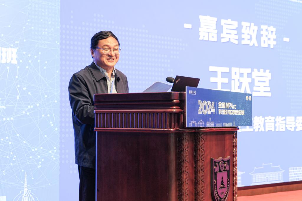 教育部“长江学者奖励计划”特聘教授、全国会计专业学位研究生教育指导委员会委员、南京大学商学院会计学系王跃堂教授致开幕辞。王跃堂教授首先代表会计教指委,向长期以来关心和支持会计专业学位研究生教育的各位领导和老师致以崇高的敬意,向参与本次培训的各位老师表示热烈的欢迎!他提到,今年是MPAcc项目设立的第二十年,也是MPAcc教育发展的第二十年,会计硕士专业学位研究生教育培养规模不断扩大,培养特色日益凸显,品牌建设卓有成效,已成为我国专业学位教育体系的重要组成部分。在多年的持续改革中,形成了以质量保障为核心,以实务导向为重点,以沟通交流为桥梁的MPAcc教育建设体系,有力推动了我国会计专业学位研究生教育事业持续健康发展。最后,王跃堂教授对承办单位表示感谢,同时预祝培训班圆满成功!