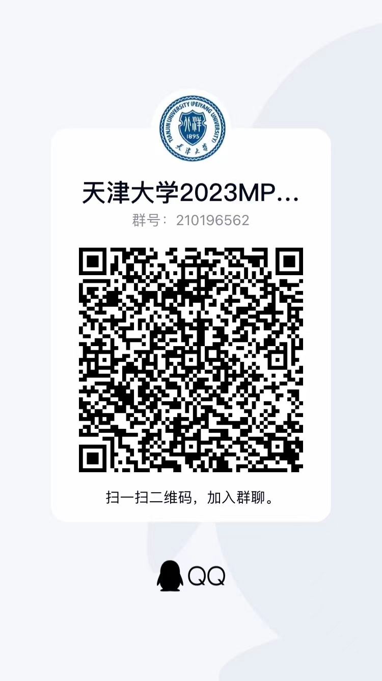 请进入面试名单的申请人扫描下图二维码,于2022年8月15日9:00前加入面试QQ群(群号:210196562),确认参加8月21日提前批面试,方便后续沟通(进入群后请改名称,格式为姓名+身份证号后四位)。未尽事宜请拨打经管学部会计专硕项目招生电话(022-27891423)详细询问。